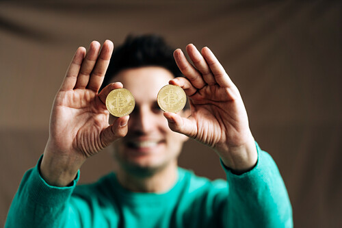 Content male trader with outstretched arms demonstrating similar metal crypto coins with letter on brown background