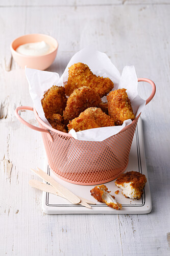 Chicken nuggets in a basket with dip