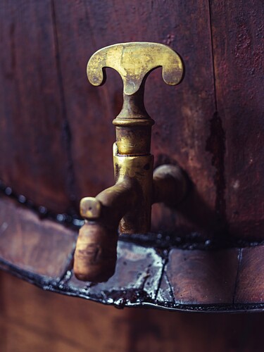 Caption:Traditional brass tap on the barrel from which dark liqueur flows