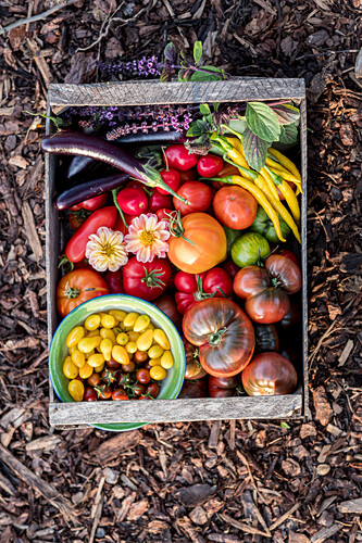 Harvest box with aubergines, tomatoes, chillies and dahlia flowers on bark mulch