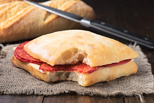 Close-up of a freshly prepared chorizo sandwich with sliced chorizo and mozzarella cheese, served on rustic bread. Ideal for delicatessen menus and food blogs.