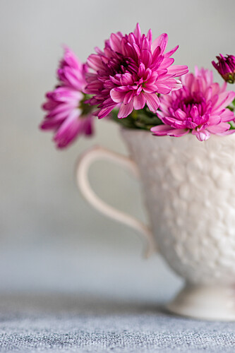 14493759 Beautiful pink flowers, elegantly arranged in a decorative white cup, standing on a lightly textured surface The soft colours and delicate blossoms create a cheerful atmosphere